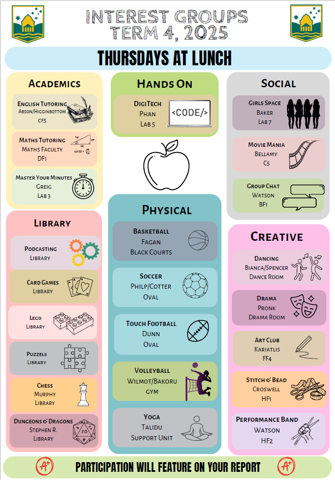 - Interest Groups every Thursday at lunchtime